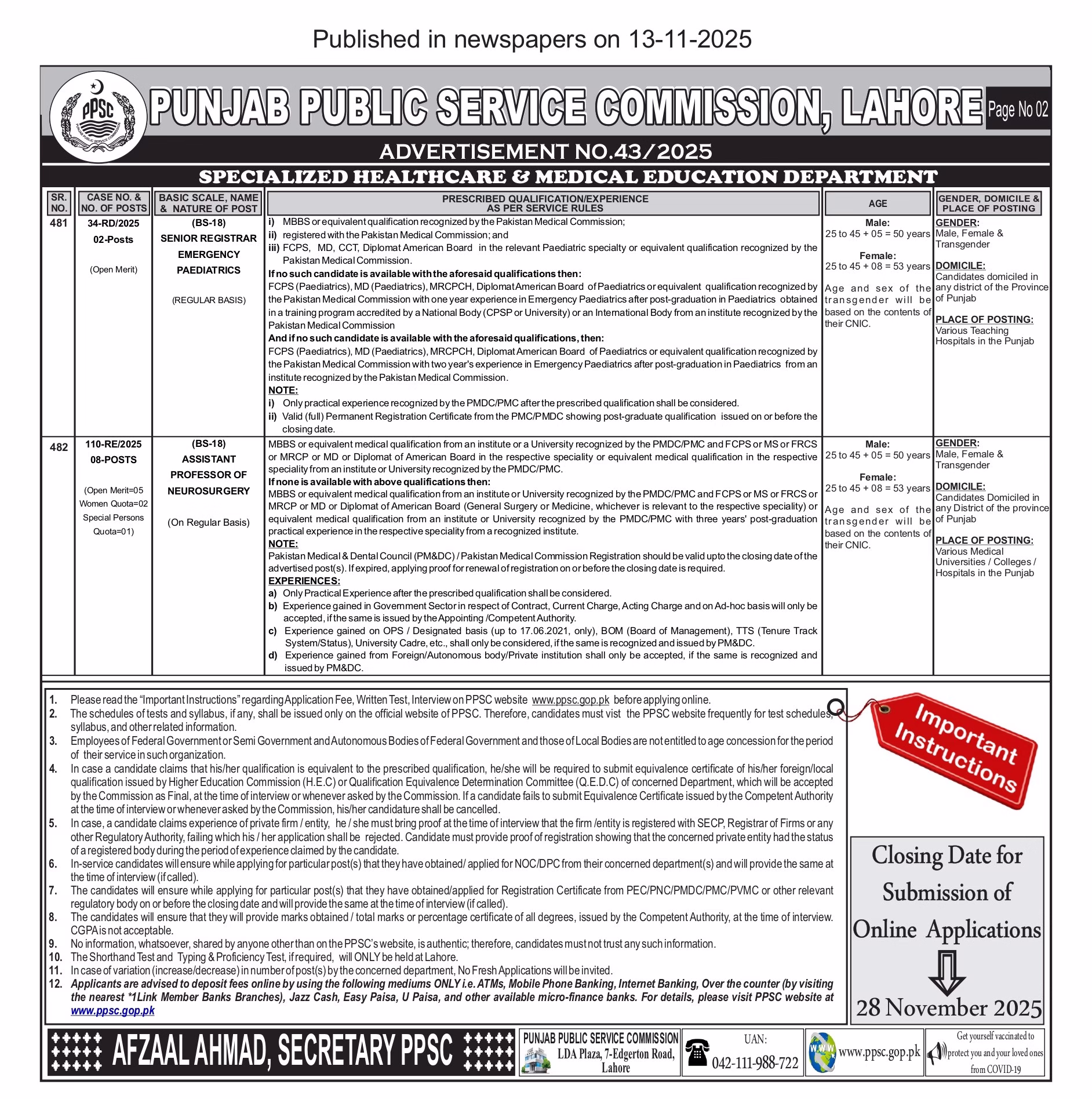 The Punjab Public Service Commission (PPSC) has announced its latest Advertisement No. 43/2025, published on 13 November 2025, offering PPSC Educator Jobs, Healthcare Jobs, and Administrative Posts across Punjab.